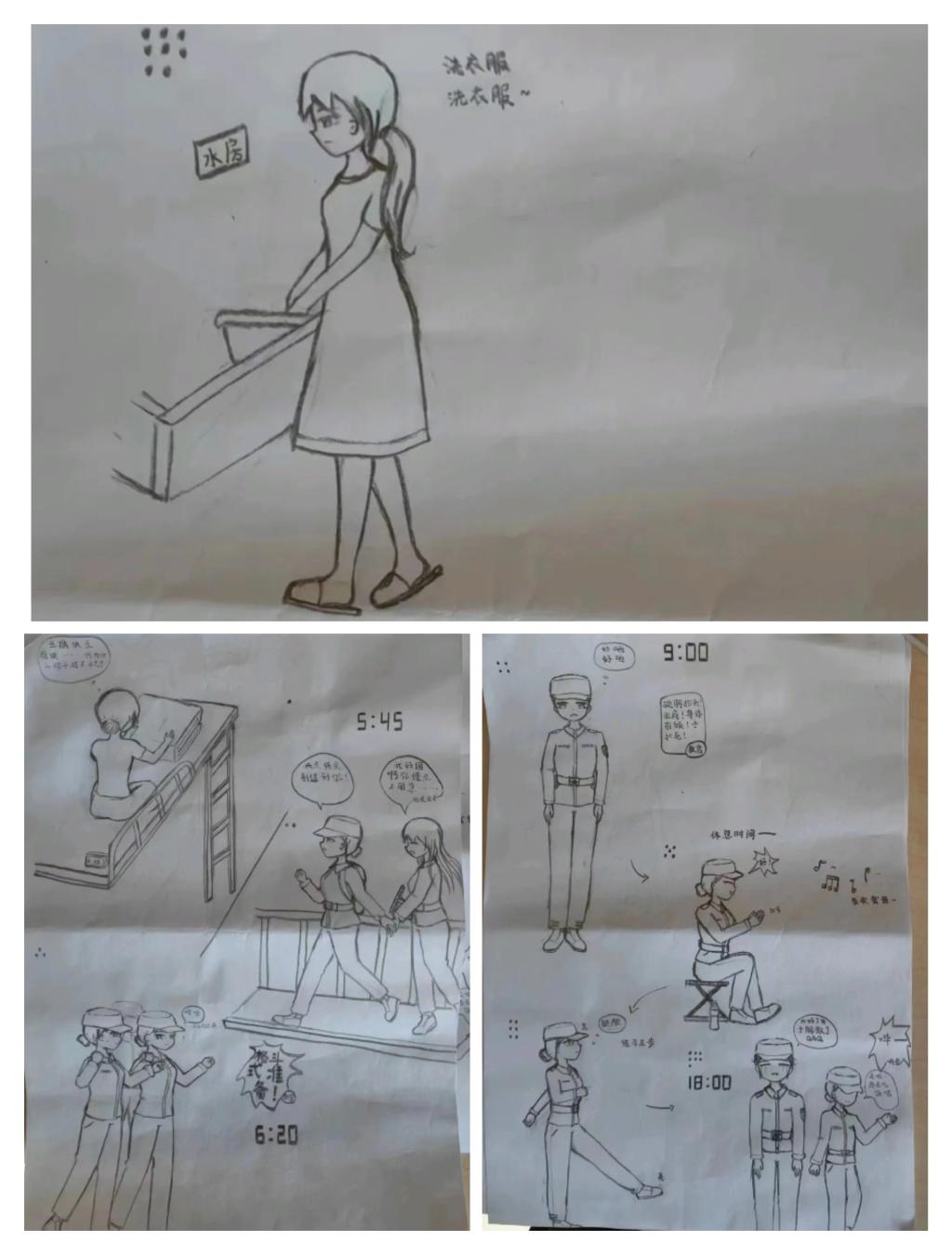 美好的时光用文字记录,有趣的瞬间用漫画定格。大一新生用漫画记录他们的成长历程,从日上三竿起到六点的早训,从跌跌撞撞到整齐划一,从嬉笑打闹到如今的纪律严明。响亮的口号,有力的步伐,站军姿、挺身板,铿锵有力地踢踏是少年迸发的青春力量。
