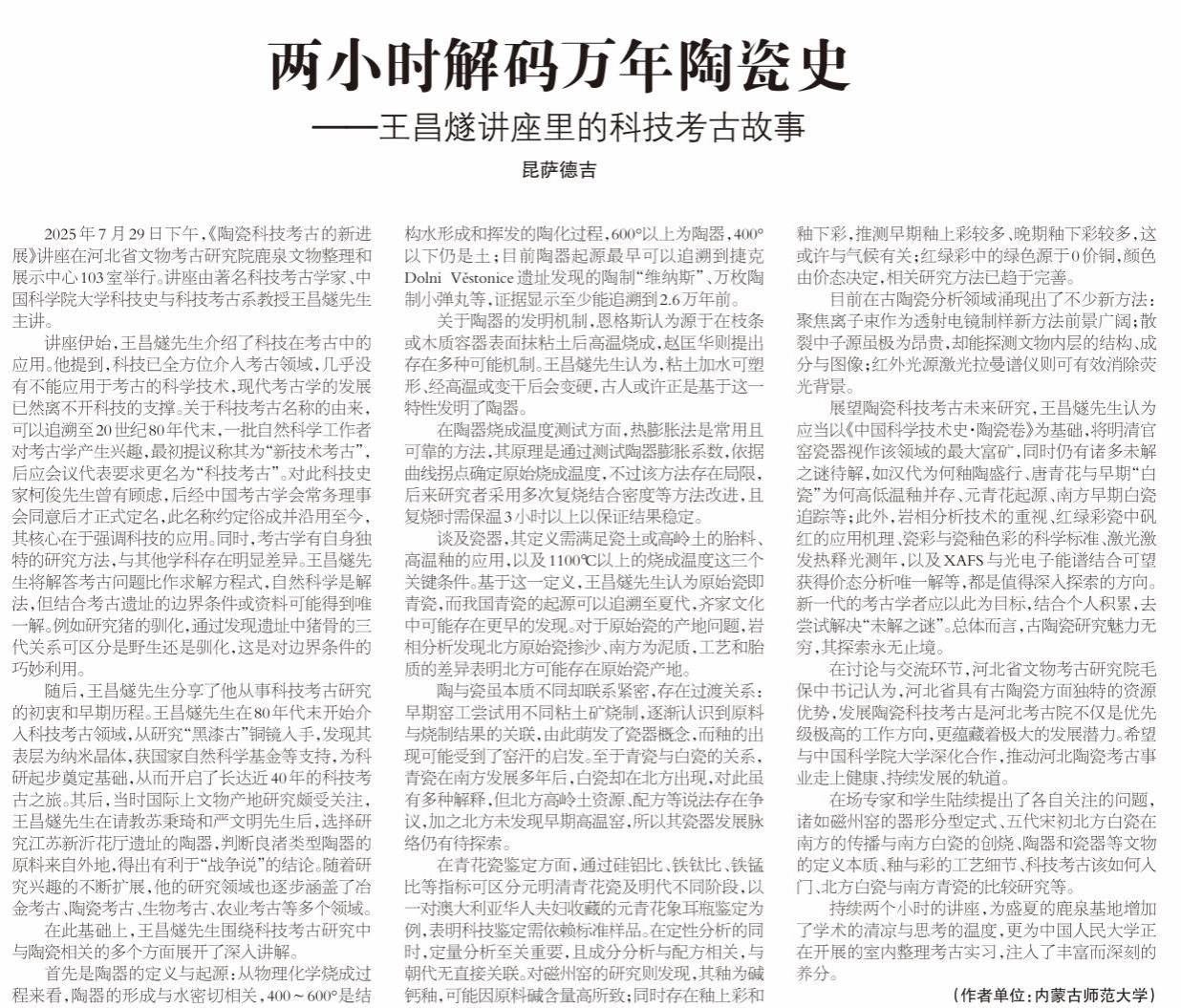 明升体育2024级考古文博班昆萨德吉同学撰写的讲座纪要《两小时解码万年陶瓷史——王昌燧讲座里的科技考古故事》在《中国文物报》2025年8月30日正式刊登。该文记录了中国科公司大学王昌燧教授于7月29日在河北省文物考古研究院鹿泉考古基地所作的专题讲座《陶瓷科技考古的新进展》。讲座纪要详细梳理了王昌燧教授以“黑漆古”铜镜研究为起点的近四十年科技考古历程,系统介绍了科技考古的学科起源、研究方法,以及陶器与瓷器的定义、起源和鉴定手段等专业内容,并分享了个人的学习感悟。